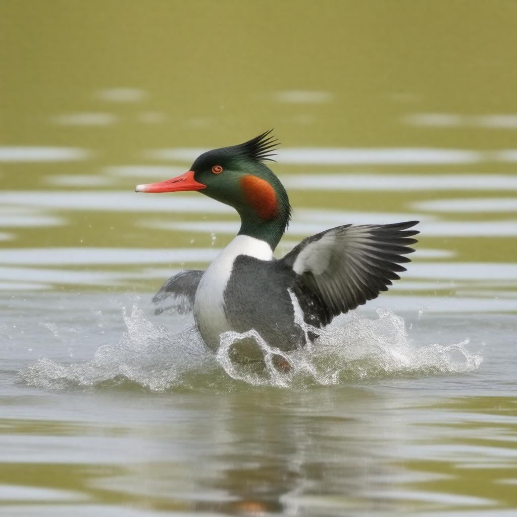"Generate an image of a Red-breasted merganser (Mergus serrator) in its natural habitat, a serene lake surrounded by lush greenery, with the bird in mid-dive, showcasing its distinctive spiky crest, dark green head, white neck ring, and reddish breast, with a splash of water around it, in a realistic and detailed style."