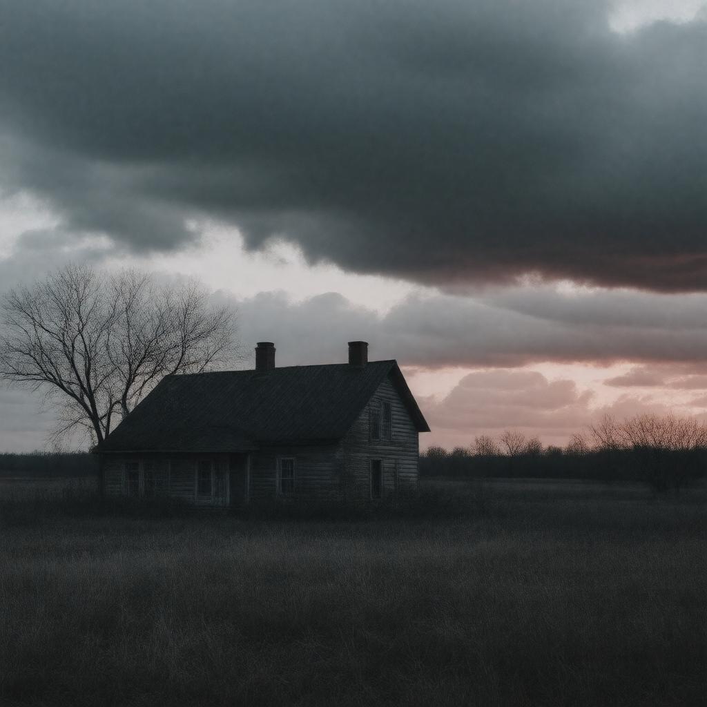 "Generate an image of a dark and ominous rural American landscape at dusk, with a small, isolated house in the foreground and a blood-red sky in the background, symbolizing the themes of religious fundamentalism, culture, and murder, as depicted in the 2011 horror-thriller film Red State."