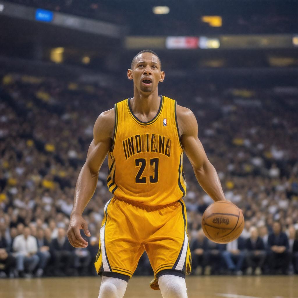 "Generate an image of Reggie Miller, a renowned American basketball player, in his iconic Indiana Pacers shooting guard uniform, mid-three-point shot, with a fiery expression, set against a blurred background of a packed NBA arena, capturing his notable clutch performance and three-point shooting skills, in a realistic and dynamic sports photography style."