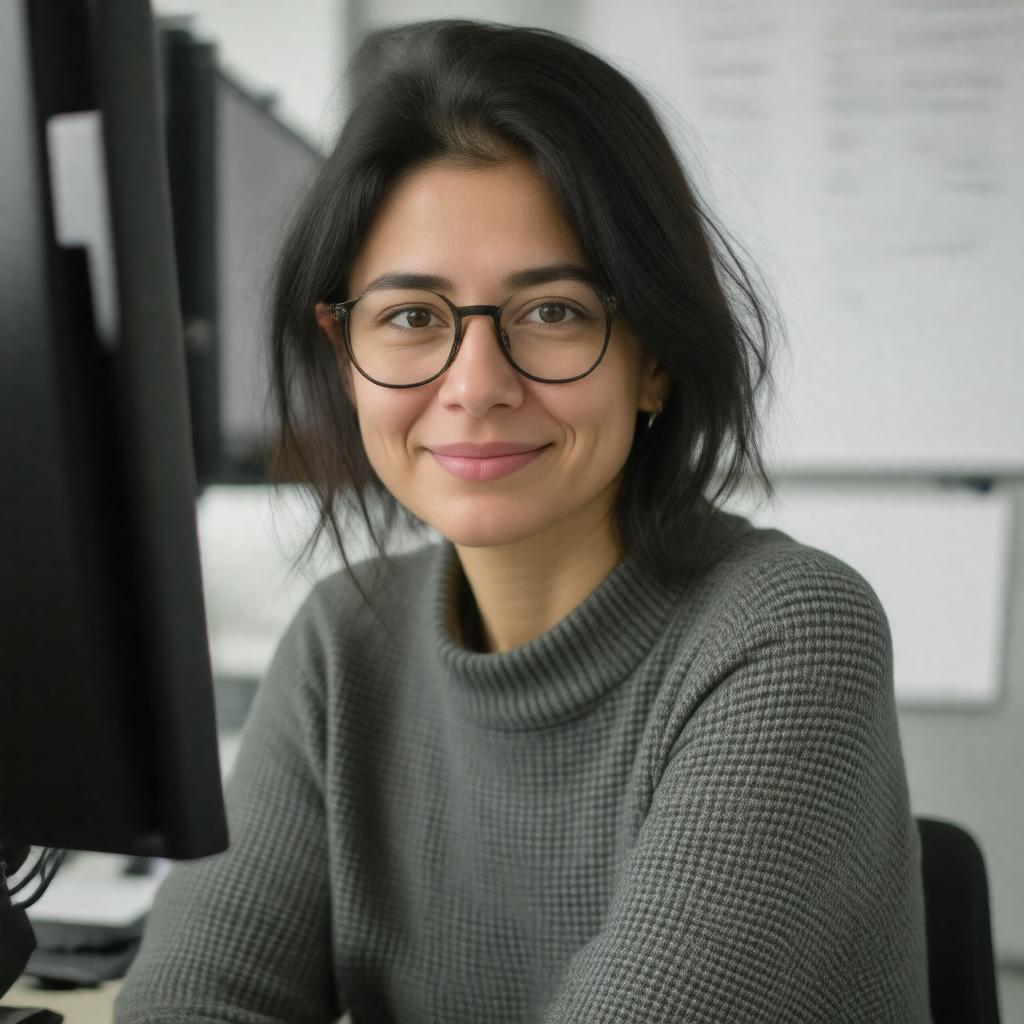 "Generate a realistic portrait of Regina Barzilay, a female computer scientist and professor, sitting in front of a computer screen with a subtle background of code and research papers, wearing a thoughtful expression, with a hint of a smile, in a style that reflects her profession and expertise in artificial intelligence, natural language processing, and machine learning."