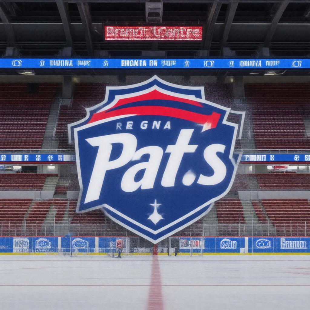 "Generate an image of the Regina Pats' logo or a team photo in front of the Brandt Centre, with a predominantly blue, red, and white color scheme, showcasing the team's branding and arena, in a realistic style."