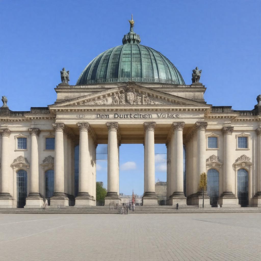 "Generate a realistic image of the Reichstag building, a protected monument and seat of the German parliament, located in Berlin, Germany, featuring its distinctive glass dome and Neo-Renaissance style, with the inscription 'Dem Deutschen Volke' above the entrance, set against a clear blue sky with the Brandenburg Gate in the background."