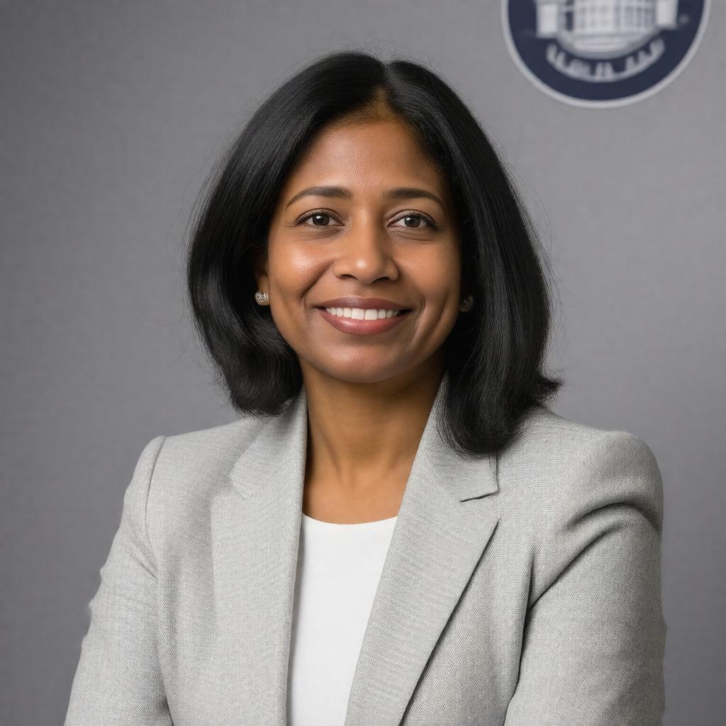 Create a realistic portrait of Renu Khator, a middle-aged Indian-American woman with a warm and authoritative smile, wearing professional attire, sitting in a dignified pose with a subtle background that hints at her connection to academia, possibly with a university building or logo in the background, reflecting her role as a prominent academic administrator and university president.