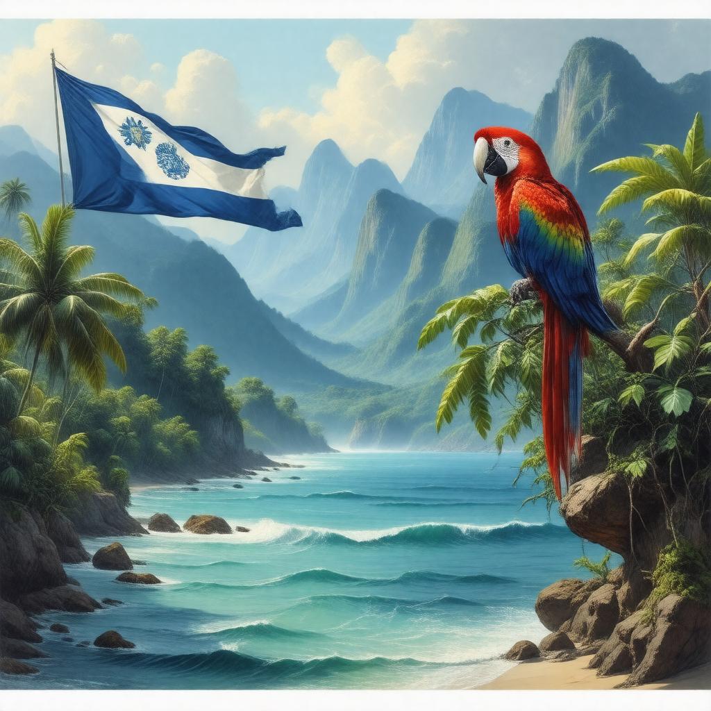 "Generate an image of a scenic landscape representing the Republic of Honduras, featuring a mix of lush tropical forests, majestic mountains, and a serene coastline along the Caribbean Sea or Pacific Ocean. Incorporate symbolic elements such as the Honduran flag waving in the wind, a Scarlet macaw perched on a branch of a Honduran mahogany tree, and a few traditional Honduran architecture styles in the background. The image should convey a sense of natural beauty, rich culture, and vibrant national pride. Style: National Geographic-inspired, with warm and vibrant colors."
