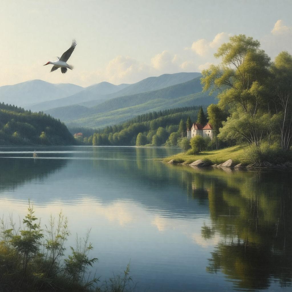 "Generate an image of a scenic landscape representing the Republic of Lithuania, featuring a mix of rolling hills, forests, and a serene lake or the Baltic Sea coastline in the background. Incorporate symbolic elements such as a white stork in flight or perched on a tree branch, and a few oak trees. In the distance, a subtle outline of the Vilnius Historic Centre or a medieval castle, such as the Vilnius Castle, could be visible. The image should reflect a sense of serenity and unity, capturing the essence of the motto 'Vienybė težydi' (Let Unity Flourish). The style should be a blend of realism and gentle impressionism, with muted colors that evoke a sense of calm and connection to nature. The flag of Lithuania or the coat of arms, Vytis, could be subtly integrated into the scene, perhaps as a watermark or a faint image in the background."