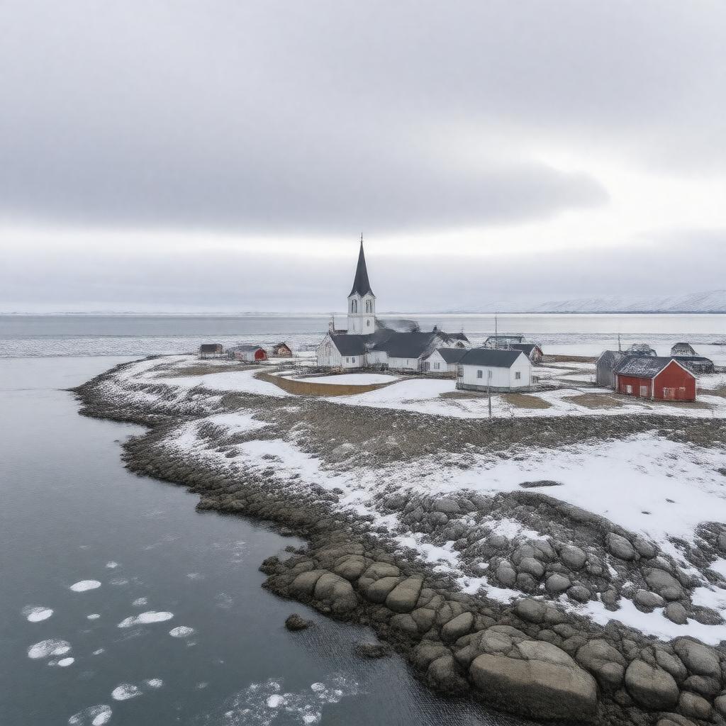"Generate a realistic image of a small, remote town in the Arctic, situated on a rocky coastline with ice and snow surrounding it, representing Resolute, Nunavut, Canada, with a few buildings, possibly including a church, homes, and a small airport in the background, under a polar climate with a cold and possibly cloudy sky, incorporating a sense of isolation and resilience."