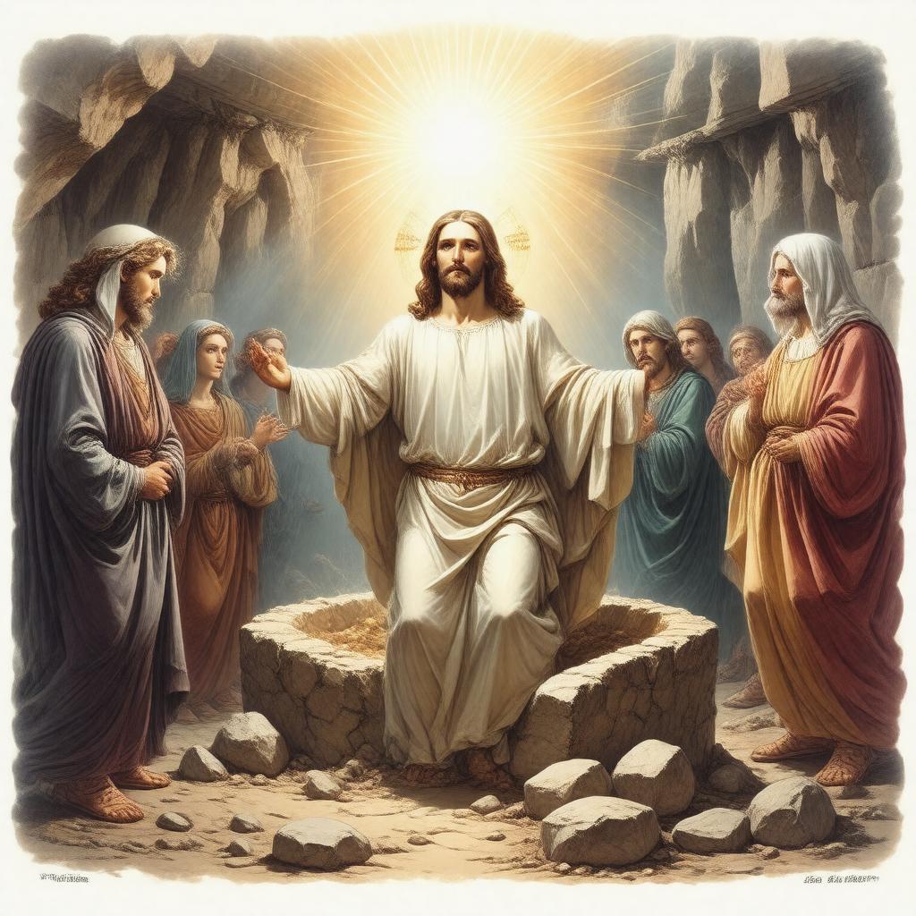 "Generate an image of the Resurrection of Jesus, depicting Jesus emerging from an empty tomb, surrounded by a radiant light, with a stone rolled away and a few witnesses in the background, including Mary Magdalene and Peter, in a style reminiscent of traditional Christian art, with a focus on conveying the significance and symbolism of this pivotal Biblical event."