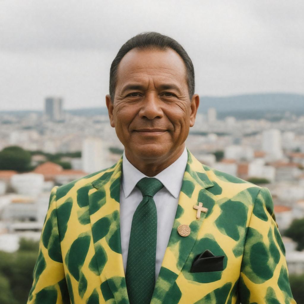 Generate a realistic image of Ricardo Nunes, the current Mayor of São Paulo, standing in front of a cityscape of São Paulo, with a subtle Brazilian flag pattern on his suit, and a gentle smile, in a formal and professional style, with a slight emphasis on his Roman Catholic faith with a discreet crucifix visible on his lapel.