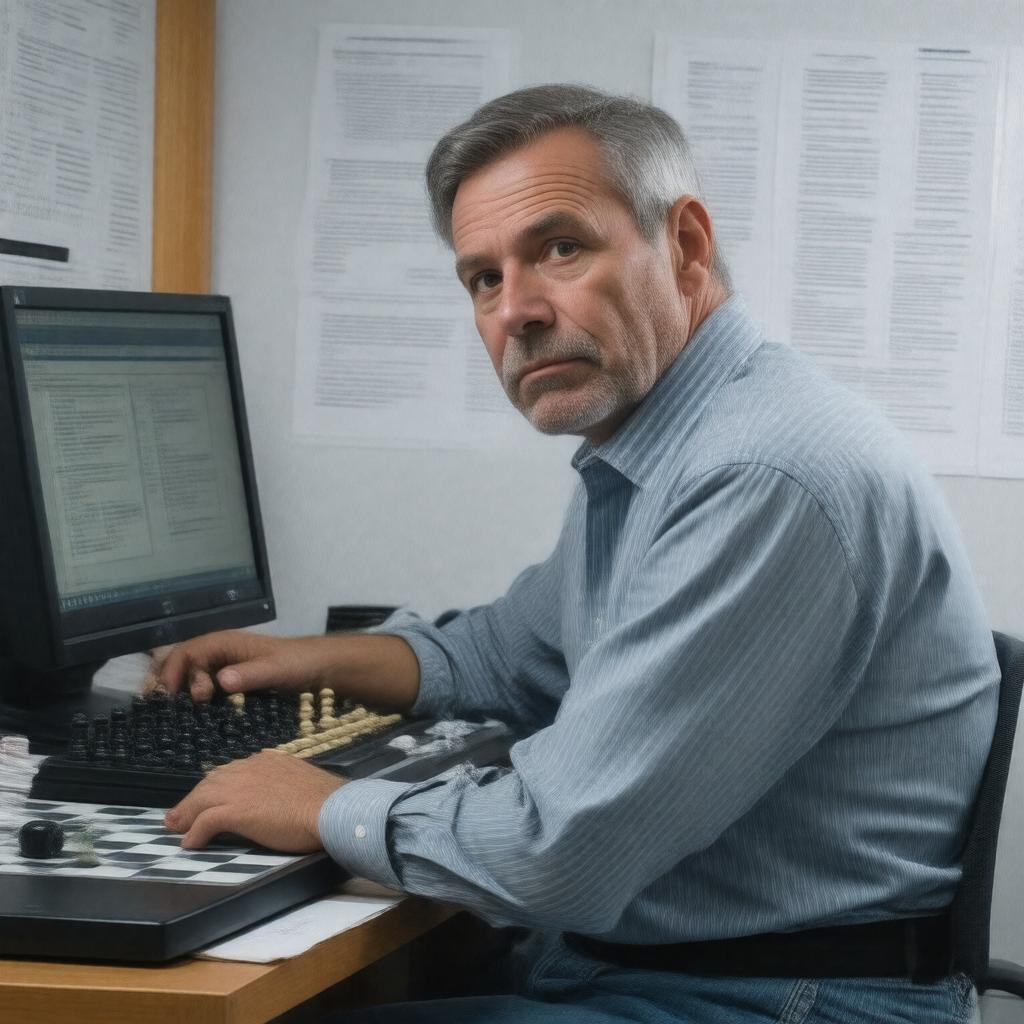 Generate a realistic image of a middle-aged American man with a thoughtful expression, sitting at a computer terminal with a chessboard nearby, surrounded by papers and notes on artificial intelligence and computer science, wearing a casual button-down shirt and jeans, with a subtle background hinting at MIT or a similar academic setting, representing Richard Greenblatt, a renowned software engineer and chess player.