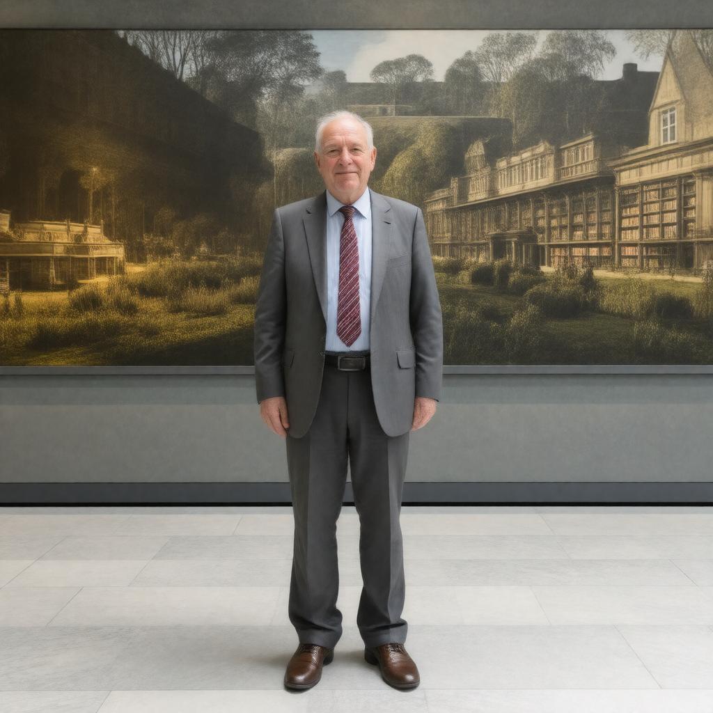 Generate a realistic image of a British architect in his 70s, with a background that reflects his profession, standing in front of one of his notable works, such as the Wellcome Wing of the Science Museum or the Ruskin Library at Lancaster University; he should be dressed in formal attire, conveying a sense of authority and expertise, with a subtle hint of a smile; the style should be a photorealistic portrait.