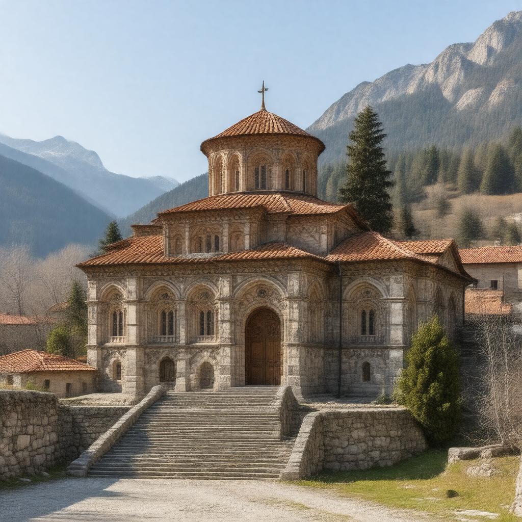 "Generate an image of the Rila Monastery, a grand Eastern Orthodox Church located in the Rila Mountains, Bulgaria, showcasing its Bulgarian National Revival architectural style, frescoes, and wood-carved iconostasis, surrounded by a serene natural landscape, in a realistic and detailed style."