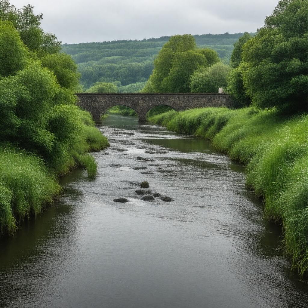 "Generate an image of a serene and picturesque river flowing through a lush green landscape with historic bridges and scenic views, representing River Teme, a 130 km long river in the United Kingdom, flowing through England and Wales, with notable features such as fishing spots, Sites of Special Scientific Interest, and charming towns like Knighton, Ludlow, Tenbury Wells, and Worcester, in a realistic and natural style."