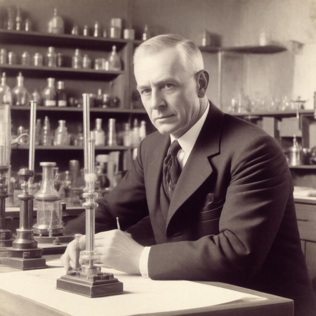 Create an image of Robert Andrews Millikan, a renowned American physicist, in his laboratory, surrounded by equipment related to his famous oil-drop experiment, wearing a suit and tie, with a thoughtful expression, in a realistic and formal style, circa 1920s.