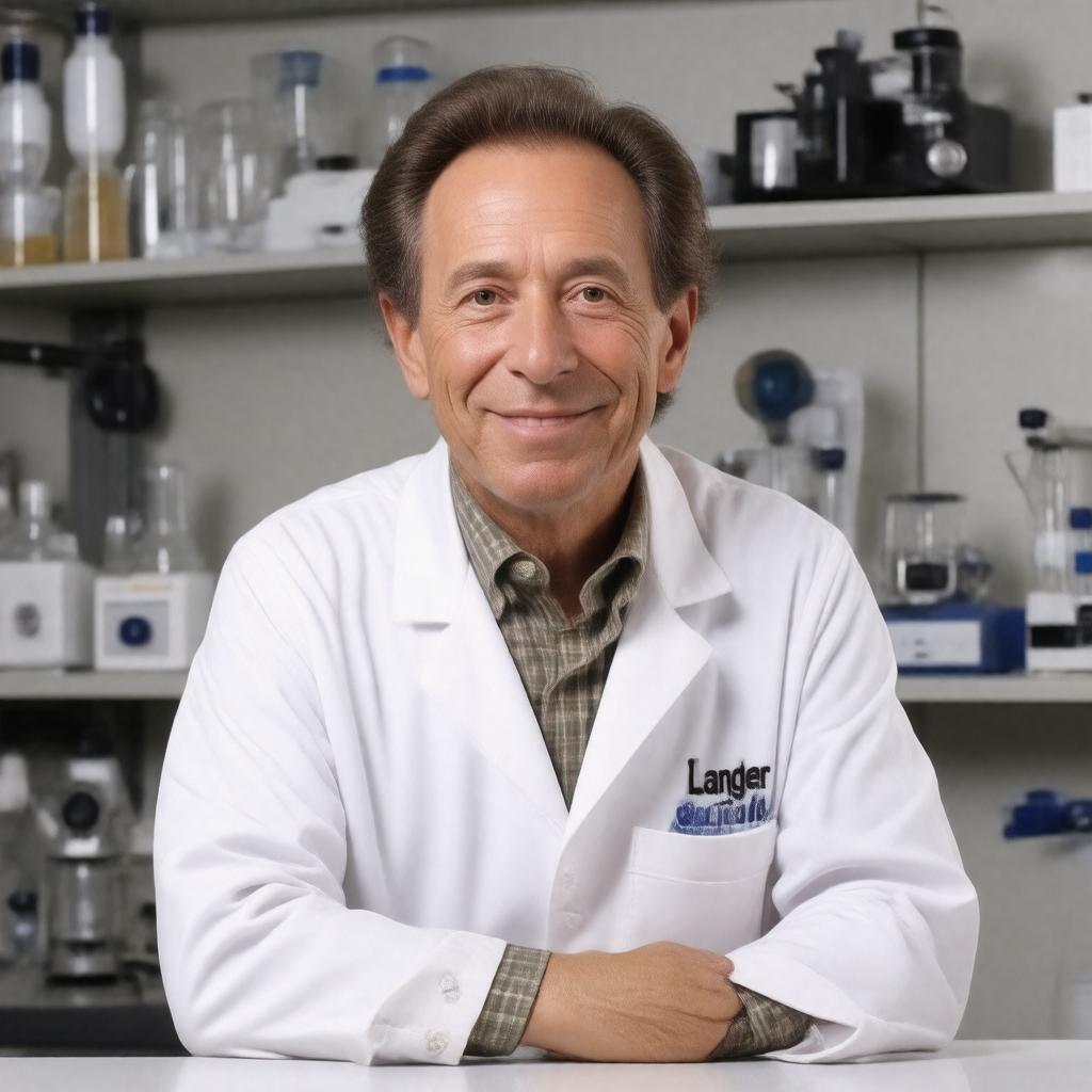 "Generate a realistic portrait of Robert Langer, a renowned American biomedical engineer and inventor, sitting in a laboratory setting with various medical equipment and devices in the background, wearing a white lab coat and a warm smile, conveying his passion for innovation and dedication to improving human health, with a hint of his numerous awards and accolades displayed on a nearby shelf or wall."