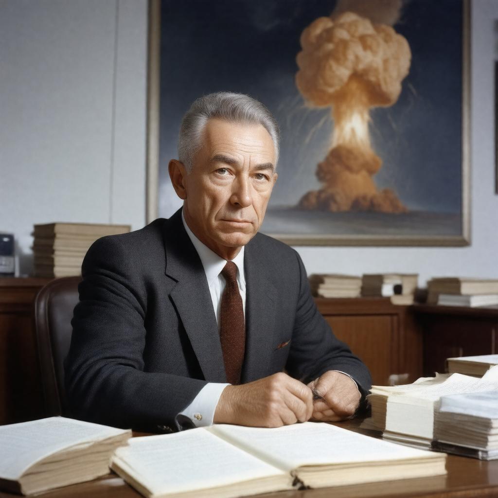 "Portrait of Robert Oppenheimer, a middle-aged man with a slender build and intense gaze, wearing a suit and tie, sitting in a study with books and papers scattered around him, with a subtle hint of a nuclear explosion in the background, symbolizing his role as the scientific director of the Manhattan Project, in a realistic and somber style."