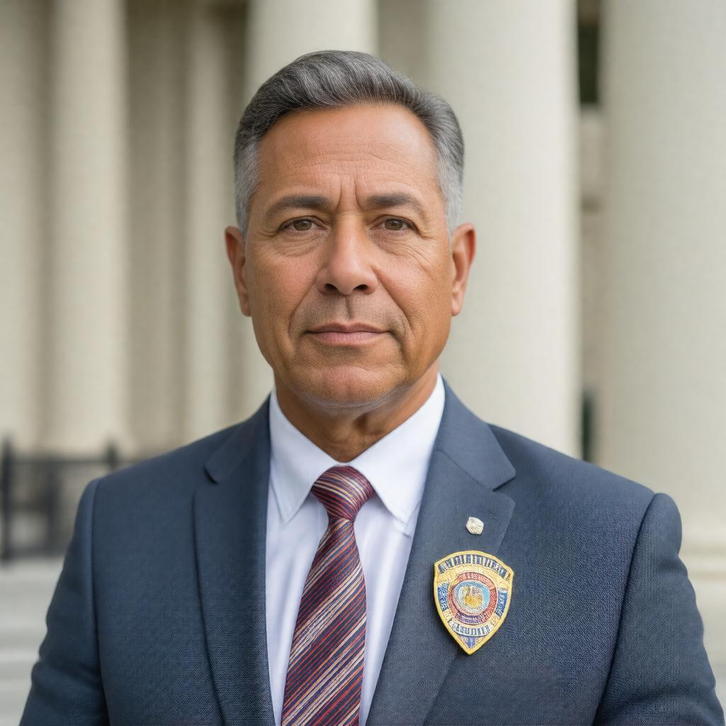 Generate a realistic image of Roberto DaSilva, a middle-aged man with a professional demeanor, standing in front of a city hall or mayor's office background, wearing a suit and a Democratic Party pin, with a subtle hint of a police badge on his lapel, symbolizing his transition from a police officer to the Mayor of Central Falls, Rhode Island, with a confident and approachable expression.