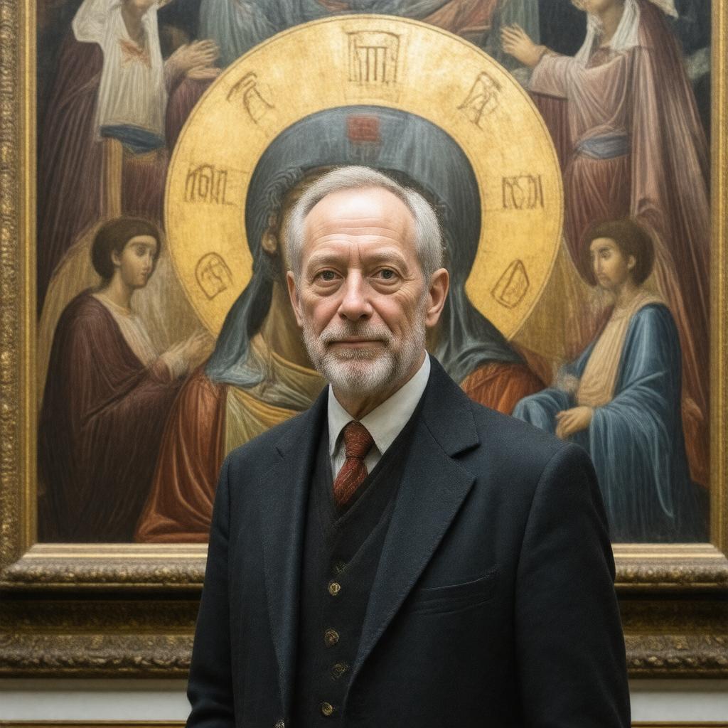 Generate a realistic image of a middle-aged British man with a kind face, wearing academic attire, standing in front of a large icon or a Byzantine-style artwork, with a subtle background of a university or art institute, representing Robin Cormack, a renowned British art historian and academic, specializing in Byzantine art.