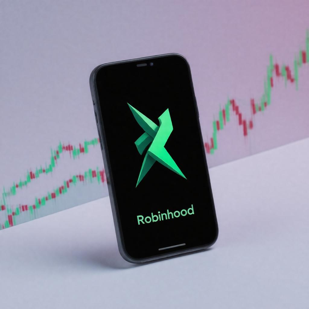 "Generate an image of the Robinhood logo or a representative scene featuring the company's mobile app on a smartphone, with a subtle background hinting at financial markets or trading, such as a faint stock market ticker or a graph; style: modern and sleek, conveying fintech innovation and accessibility; color scheme: bold and vibrant, reflecting the company's youthful and disruptive approach to financial services; gptkbp:instance_of: financial services company"
