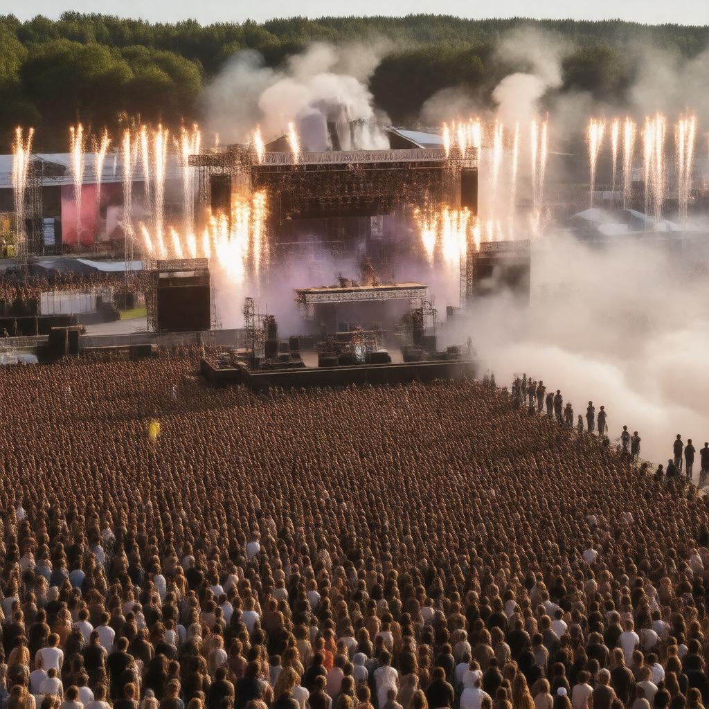"Generate an image of a crowded outdoor music festival with multiple stages, featuring a variety of rock music performances, set against the backdrop of the Nürburgring in Germany, with a lively and energetic atmosphere, incorporating iconic elements such as a large festival crowd, pyrotechnics, and a vibrant color scheme, representing Rock am Ring, a prominent annual music festival."