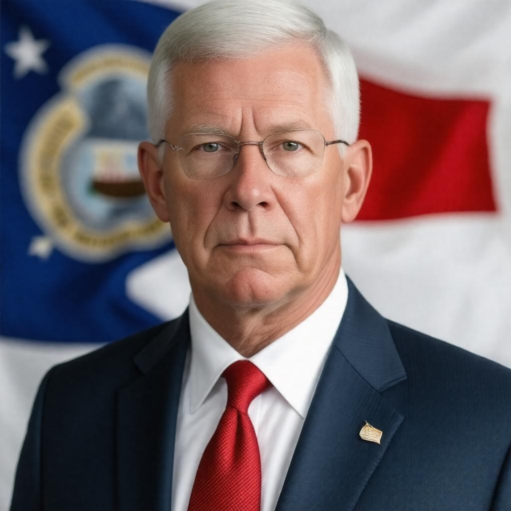 "Generate a realistic portrait of Roger Wicker, a middle-aged American politician with a serious expression, wearing a suit and tie, with a subtle hint of a Southern charm, set against a backdrop of the Mississippi state flag or a subtle Senate-inspired environment, in a formal and dignified style reminiscent of official government portraits."