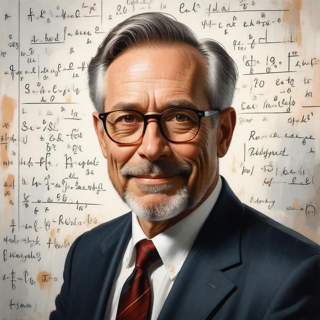 Generate an image of a middle-aged man with a gentle smile, wearing a pair of glasses and a suit, standing in front of a whiteboard filled with complex mathematical equations, representing Ronald Linn Rivest, a renowned American computer scientist and cryptographer, best known for his work on the RSA algorithm and other cryptographic protocols. The style should be a realistic portrait with a professional and intelligent atmosphere.