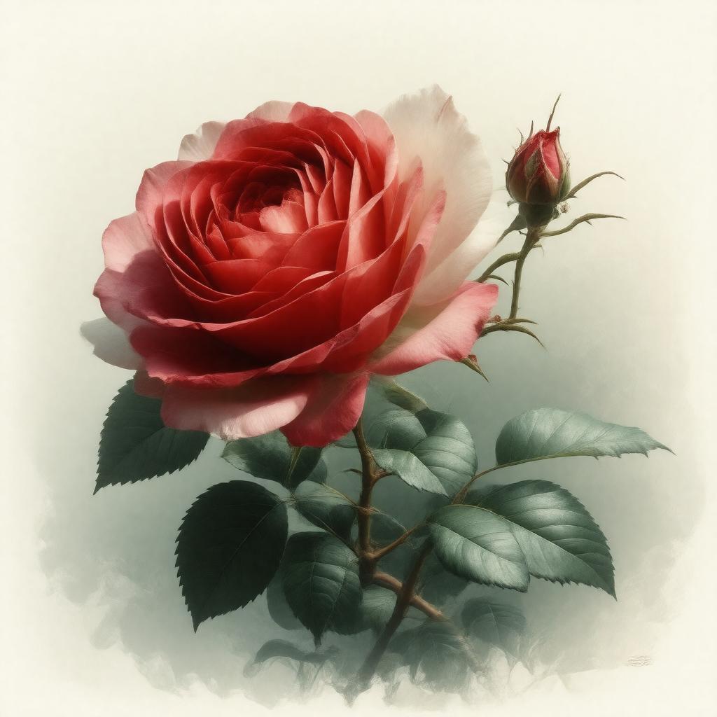 "Generate an image of a beautiful, blooming Rosa, specifically a hybrid tea rose with red, pink, and white flowers, set against a lush, green background with pinnate leaves and thorns visible on the stem, symbolizing love and beauty, in a realistic and detailed style."