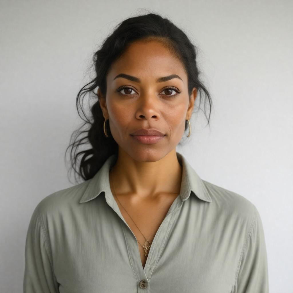 "Generate a realistic portrait image of Rosario Dawson as a human, specifically depicting her as a 43-year-old American actress, producer, singer, and voice actor, with a mix of Puerto Rican, Cuban, Afro-Cuban, Irish, and Native American features, wearing a neutral outfit, with a subtle background that hints at her involvement in environmentalism and social activism, in a photorealistic style."