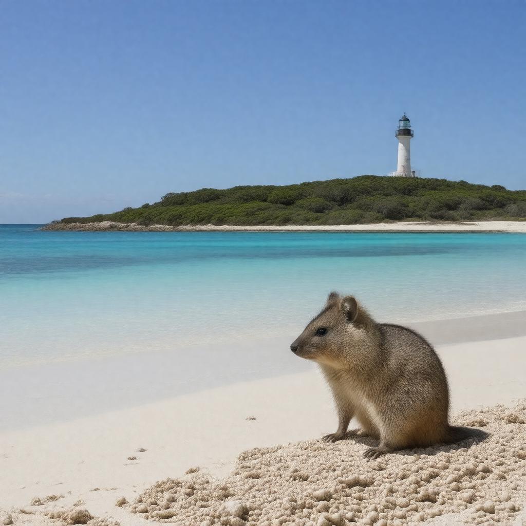 "Generate an image of a serene island landscape with turquoise waters and white sandy beaches, featuring a quokka in the foreground, with the Wadjemup Lighthouse standing tall in the background. The image should capture the natural beauty of Rottnest Island, Western Australia, with lush greenery and a clear blue sky. Style: Photorealistic."