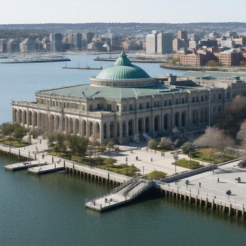 "Generate a photorealistic image of Rowes Wharf, a prominent mixed-use development and landmark in Boston, Massachusetts, United States. The image should showcase the wharf's distinctive domed rotunda, waterfront plaza, and public dock, with the Boston Harbor Hotel, office spaces, residential condominiums, marina, and restaurants visible. The wharf should be depicted overlooking Boston Harbor, with a connection to the Rose Kennedy Greenway and Harborwalk. Incorporate a daytime setting with clear skies to highlight the wharf's architectural features and bustling activity."
