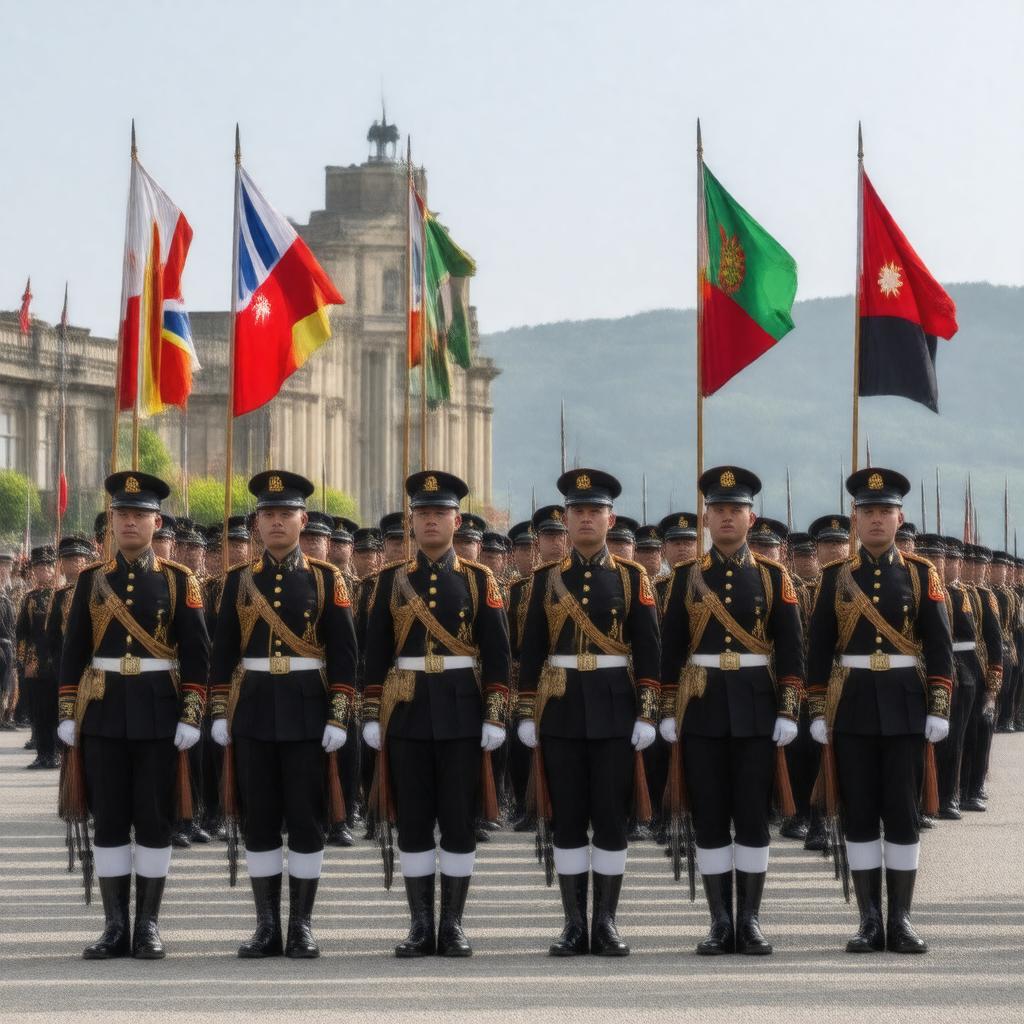 "Generate an image of a group of Royal Gurkha Rifles soldiers in their ceremonial uniforms, standing at attention in front of a backdrop of the British and Nepalese flags, with the regimental colours of black, green, and red prominently displayed, and a subtle hint of the Sir John Moore Barracks in Folkestone, Kent, in the background, symbolizing the regiment's history and heritage as a line infantry unit of the British Army, with a sense of pride and loyalty."