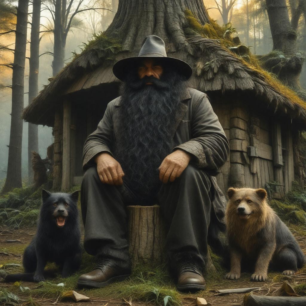 "Generate a warm, golden-lit portrait of Rubeus Hagrid, set against the rustic backdrop of his hut on the edge of the Forbidden Forest. Depict him as a towering half-giant with black hair and eyes, wearing his signature gamekeeper attire, including a worn leather jacket and a wide-brimmed hat. He should be seated on a tree stump, surrounded by various magical creatures, such as Fang, Buckbeak, and Norbert, showcasing his love and care for them. Incorporate subtle hints of his incredible strength, while maintaining a gentle and kind expression, highlighting his nurturing and protective nature."