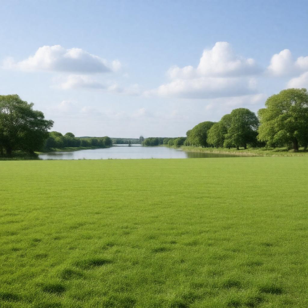 "Generate an image of a serene and historically significant landscape, specifically a large grassy meadow situated near a river, with several monuments and memorials in the distance. The meadow, known as Runnymede, should be surrounded by lush greenery and have a few trees scattered throughout. In the background, the River Thames should be visible. Include the Magna Carta Memorial, John F. Kennedy Memorial, and Air Forces Memorial in the scene. The image should be taken during a sunny day with a few clouds in the sky, and have a realistic and peaceful atmosphere, showcasing both the natural beauty and historic significance of the site."