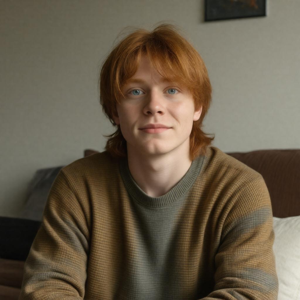 "Generate a realistic portrait of Rupert Grint as Ron Weasley from the Harry Potter film series, sitting in a cozy setting with a subtle background, wearing a casual outfit, with his signature red hair and blue eyes, conveying a sense of warmth and friendliness, in a style reminiscent of a film still or a celebrity photo shoot."