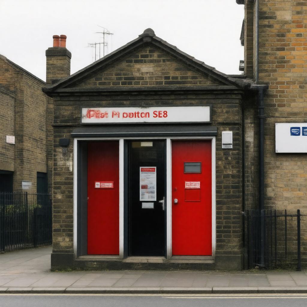 "Generate a realistic image of a post office located in the London area code SE8, specifically in the neighborhoods of Deptford, Evelyn, or Surrey Quays, with a style that reflects a typical British postal service building, surrounded by urban scenery."