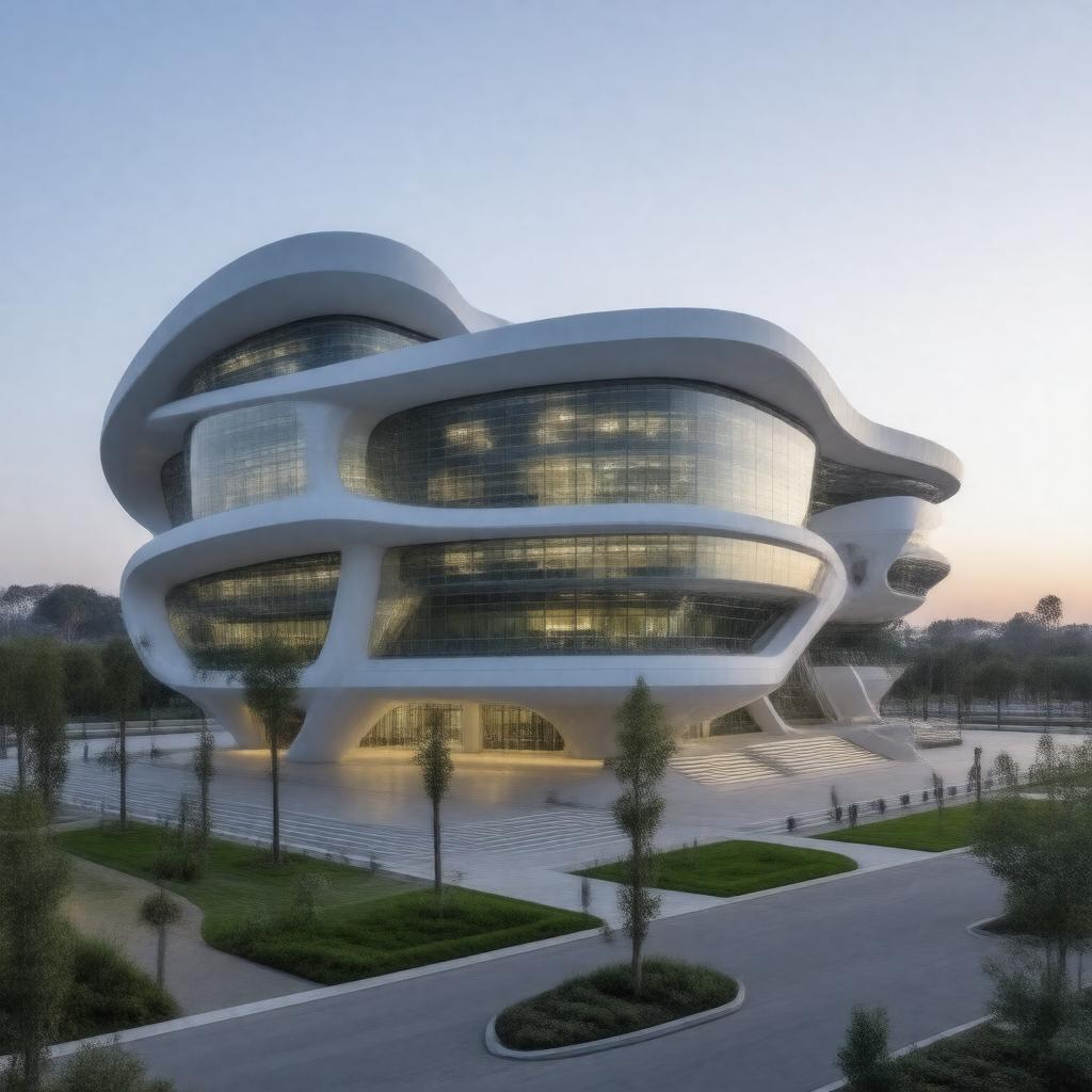 "Generate an image of the SRI International headquarters building in Menlo Park, California, United States, with a futuristic and innovative vibe, incorporating elements that reflect the organization's focus areas such as artificial intelligence, robotics, and technology, with a subtle background hint of the organization's 1500 employees working on various projects."
