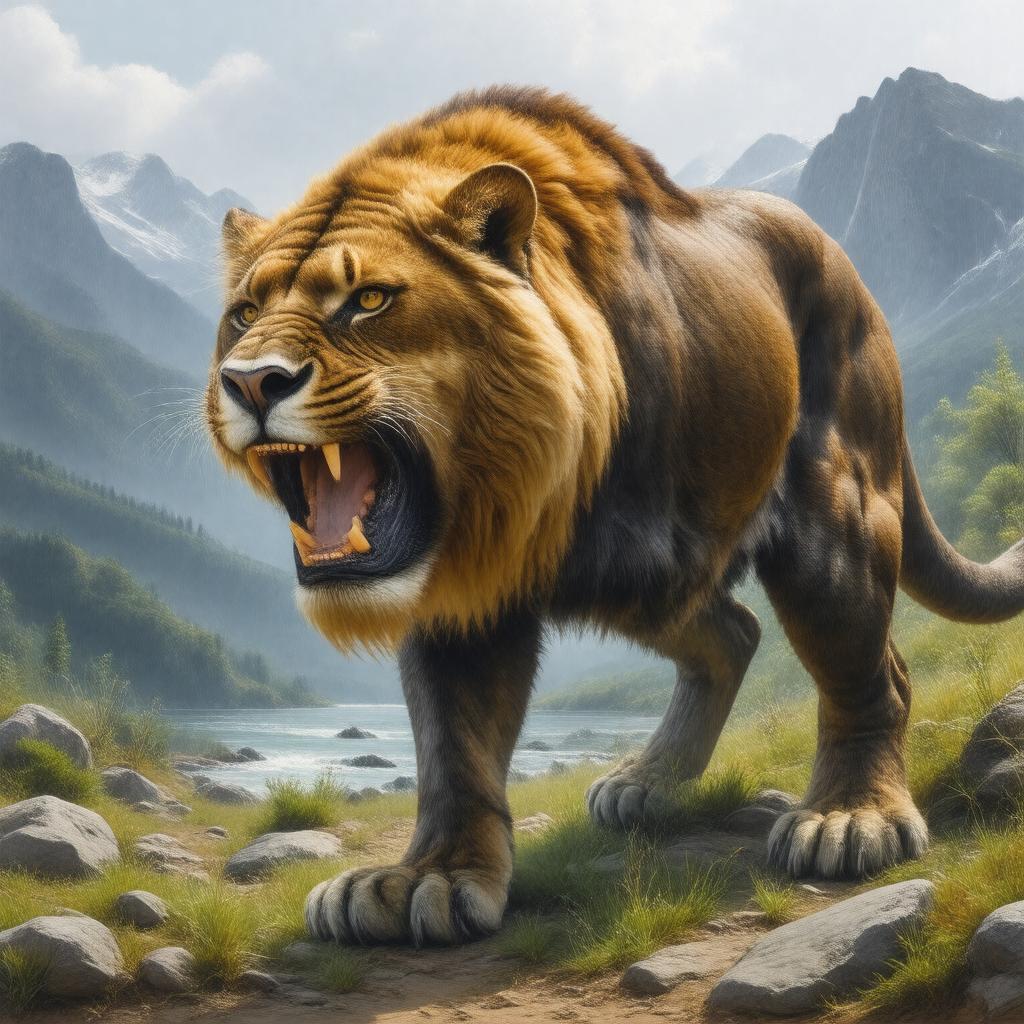 "Generate an image of a Smilodon, a large prehistoric feliform mammal, with elongated upper canine teeth, in a realistic and detailed style, set against a Pleistocene-era landscape, with a focus on showcasing its distinctive features and size, up to 400 kg, with an emphasis on its role as a top carnivore predator, circa 10,000 years ago, in a naturalistic and scientifically accurate manner."