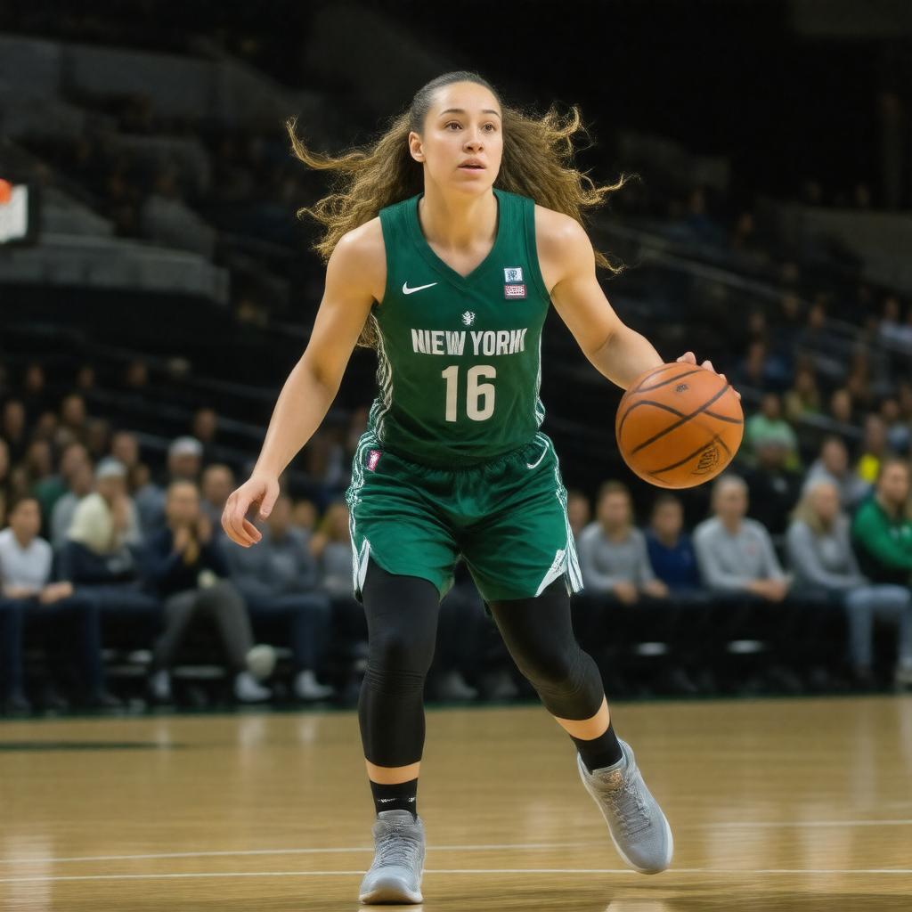 Generate an image of Sabrina Ionescu, a professional basketball player, in her New York Liberty uniform, mid-game, with a basketball in hand, showcasing her skills on the court, in a realistic sports photography style.