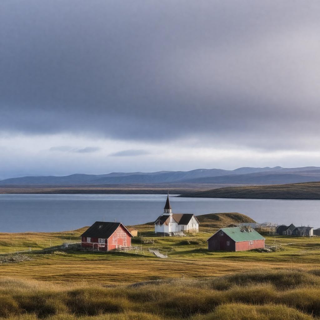 "Generate an image of a small, remote hamlet situated on the coast of Banks Island in the Northwest Territories of Canada, with a few buildings, possibly including some colorful houses and a church, surrounded by vast tundra landscape and rugged coastline, under a dramatic Arctic sky, in a realistic style."