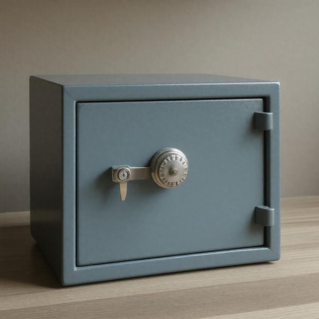 Generate an image of a secure, metal lockable box with a combination dial and a sturdy handle, representing a "safe" in a realistic and detailed style, with the title "Safe (lockable box)" and show it in a home or office setting.