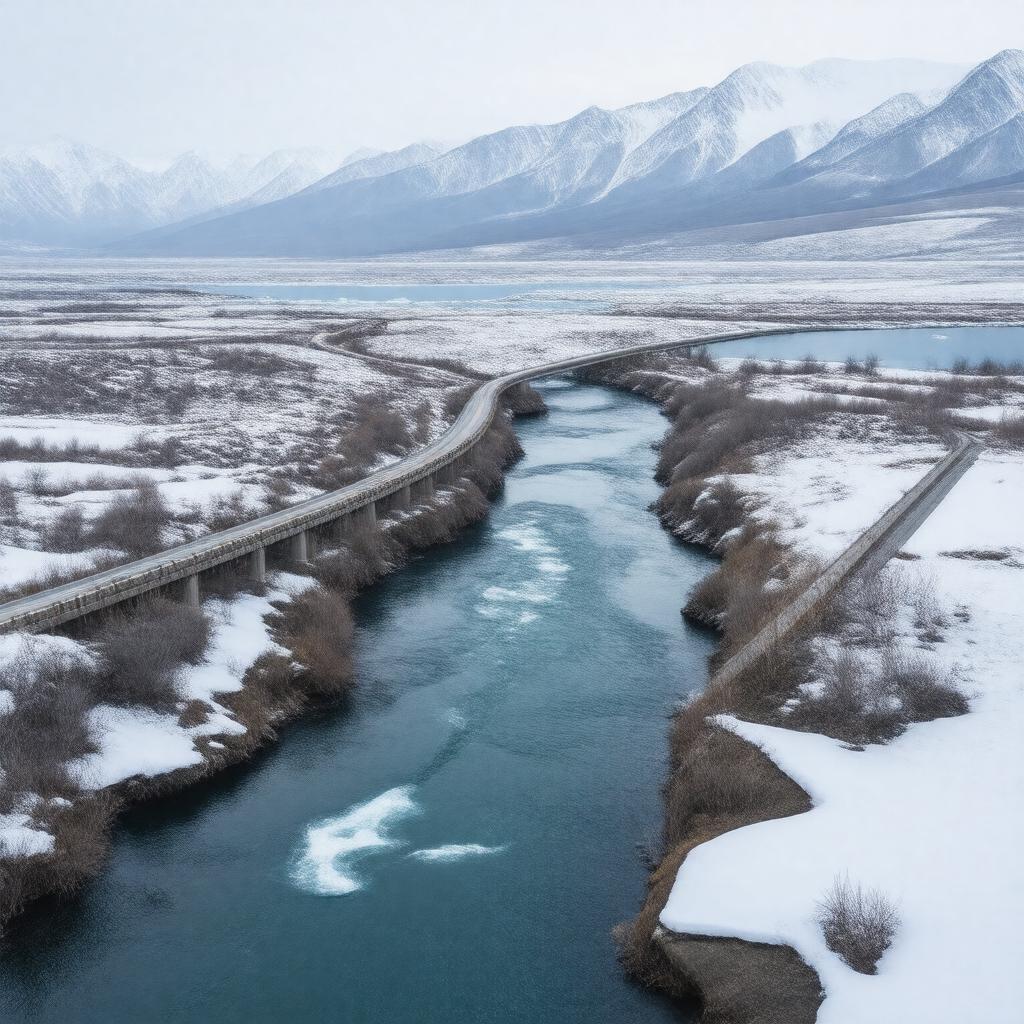 "Generate an image of a serene river flowing through a vast, Arctic landscape, surrounded by mountains and tundra, with a few pipelines and a highway bridge crossing over it, ultimately emptying into a bay with icebergs and a distant sea, in a realistic and natural style."