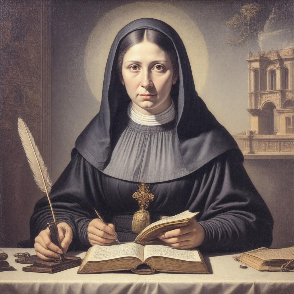 Create an image of Saint Teresa of Avila, a 16th-century Spanish saint, priest, and Catholic reformer, depicted in a contemplative and mystical setting, wearing a Carmelite habit, with a book and a quill in her hand, surrounded by elements that reflect her spiritual writings, such as "The Interior Castle" and "The Way of Perfection", with a subtle background that hints at her connection to the Discalced Carmelites and the city of Ávila, Spain, in a Baroque-style painting with warm and golden lighting.