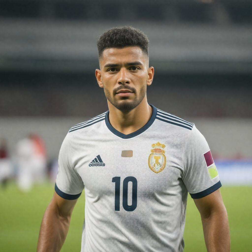 A realistic portrait of Saleh Gomaa, a male Egyptian footballer, wearing a football jersey with the number 10, in a midfielder position, with a determined expression, set against a blurred background of a football stadium, in a photorealistic style.