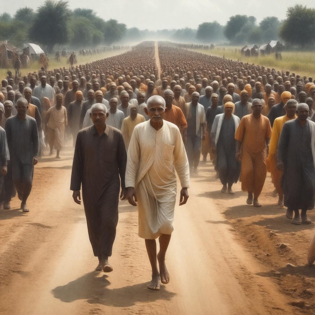 "Generate an image of a massive procession of people marching on a dusty road, with the leader, Mahatma Gandhi, in the forefront, walking with a determined stride, amidst the Indian landscape, with a backdrop of rural Indian villages and fields, symbolizing the historic Salt March or Dandi March, a pivotal moment in the Indian independence movement, with a sense of resilience and nonviolent resistance, in a realistic and documentary-style illustration."