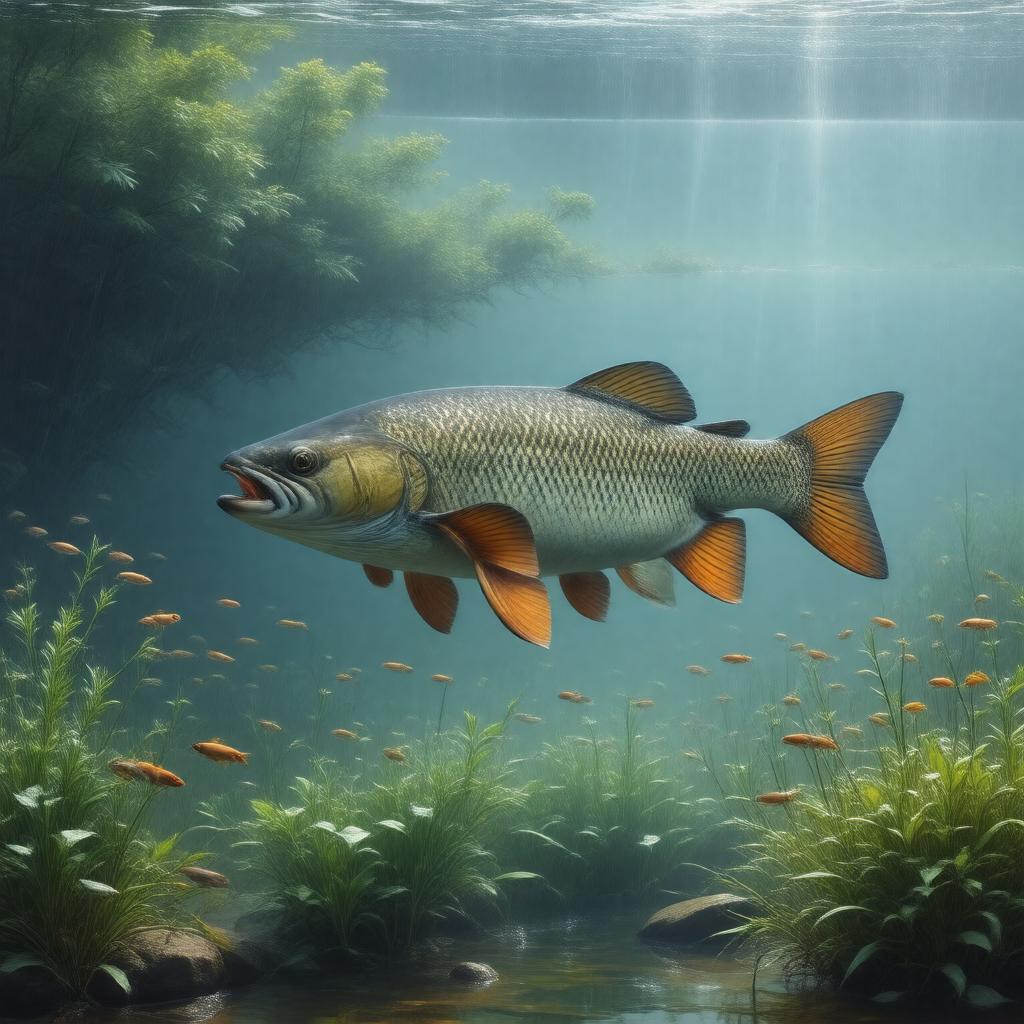 "Generate an image of a char, specifically a Salvelinus alpinus, swimming in a freshwater lake in the Northern Hemisphere, surrounded by aquatic plants and with a school of smaller fish in the background, in a realistic and detailed style."