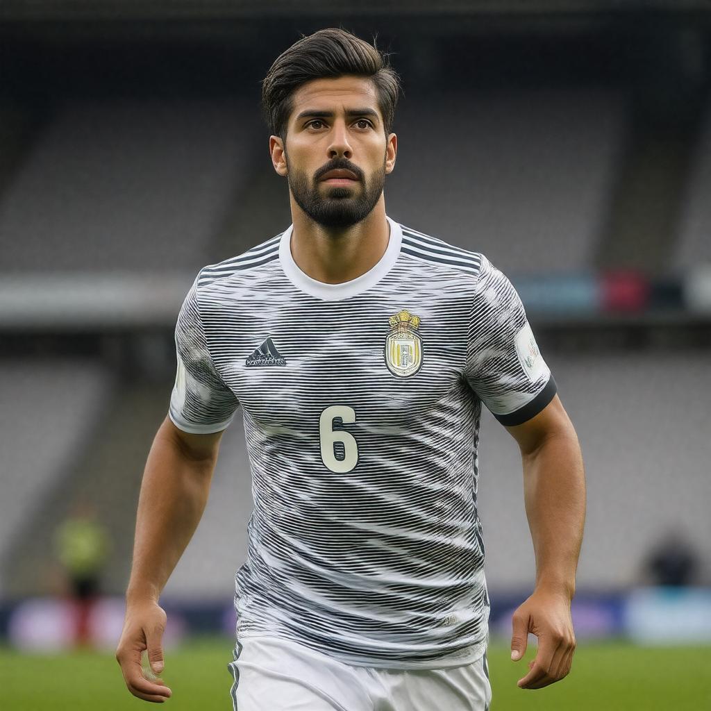 "Generate a realistic image of Sami Khedira, a German footballer, in his midfield position, wearing a jersey with the number 6, with a calm and focused expression, set against a blurred background of a football stadium, with a style that resembles a sports photography shot."