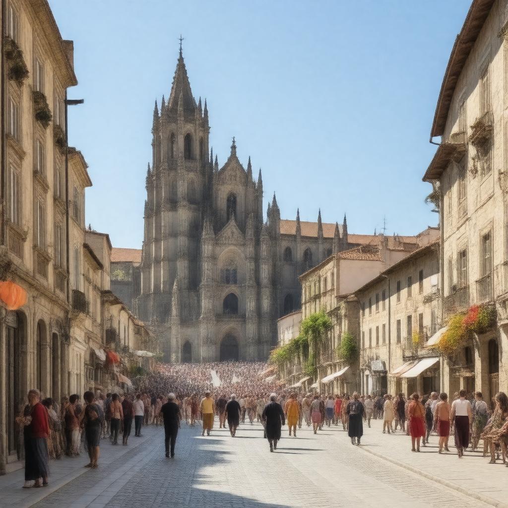"Generate a realistic image of Santiago de Compostela, a city in northwest Spain, showcasing its historic center and the iconic Cathedral of Santiago de Compostela, with pilgrims and tourists walking in the streets, under a warm and sunny day."