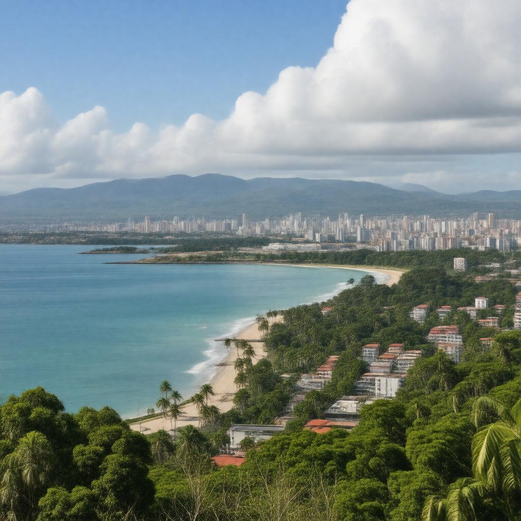 "Generate a realistic image of Santos, a city located on Santos Bay in the state of São Paulo, Brazil, showcasing its urban landscape, possibly with a view of the Port of Santos and the Estádio Urbano Caldeira in the background, under a bright tropical rainforest climate sky, with a subtle hint of the Gonzaga Beach or Ponta da Praia Beach in the distance."