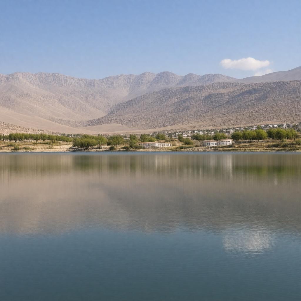 "Generate a serene and natural image of a lake, specifically Sarakhs Lake, located in Razavi Khorasan Province, Iran, near the city of Sarakhs. The image should realistically depict the lake's landscape, incorporating surrounding natural features and possibly distant views of the nearby town or province's characteristic architecture, in a calm and picturesque style."