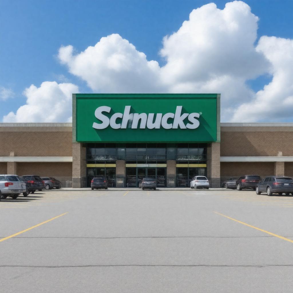 "Generate an image of the exterior of a Schnucks supermarket, a large retail grocery store with a prominent sign reading 'Schnucks' in a friendly, approachable font, set against a bright blue sky with a few fluffy white clouds. The store's facade features a modern design with a glass front, and a large parking lot filled with cars. Incorporate the Schnucks logo prominently in the image. The style should be a realistic, daytime depiction with a mix of architectural details and lush greenery."