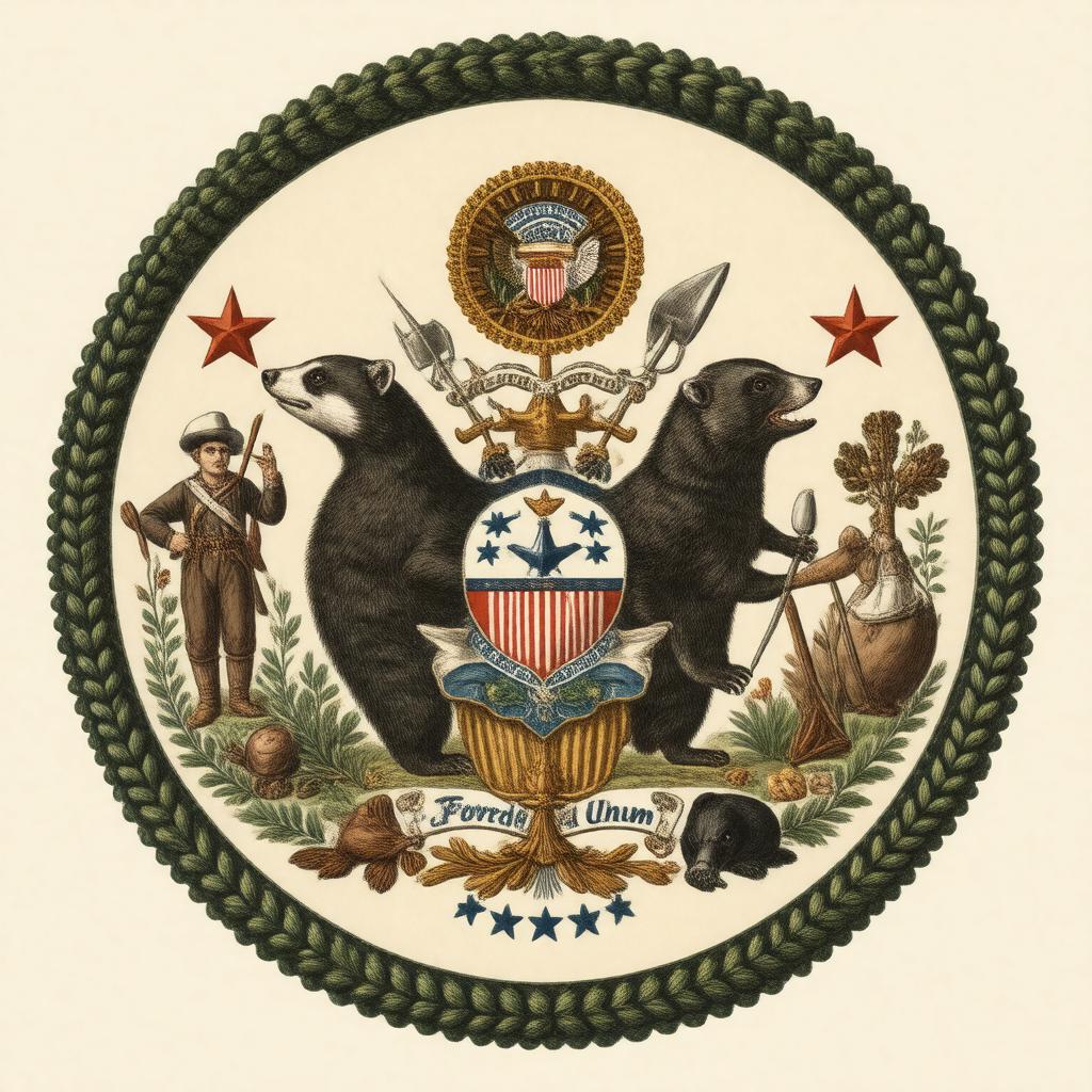 gptkb:anchor thirteen stars badger plow cornucopia United States shield arm and hammer lead ingots motto 'E Pluribus Unum' motto 'Forward' pick and shovel yeoman |